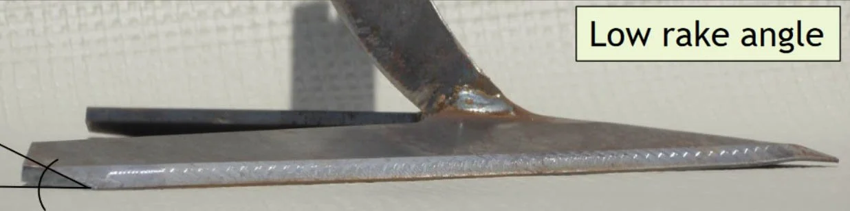 A European-style sweep with a very low rake angle - flat to the ground for shallow and early cultivation.