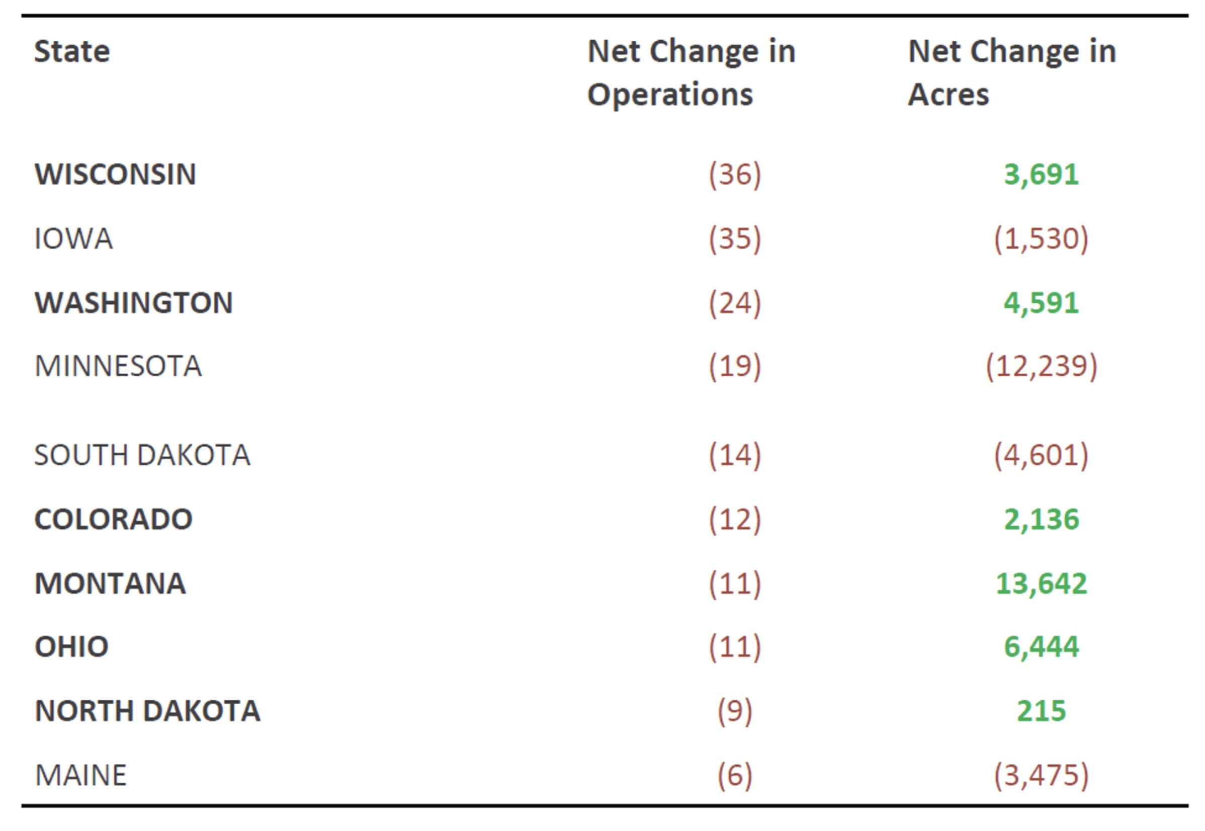 Interestingly, some states with high operation net losses showed acreage gains. Wisconsin lost 36 operations but gained 3,691 acres. Montana lost 11 operations yet gained 13,642 acres. These patterns suggest certified operations may be adding additional acres to their operations, though there are a number of other possible explanations and further analysis of the OID is required to more fully reveal the cause.