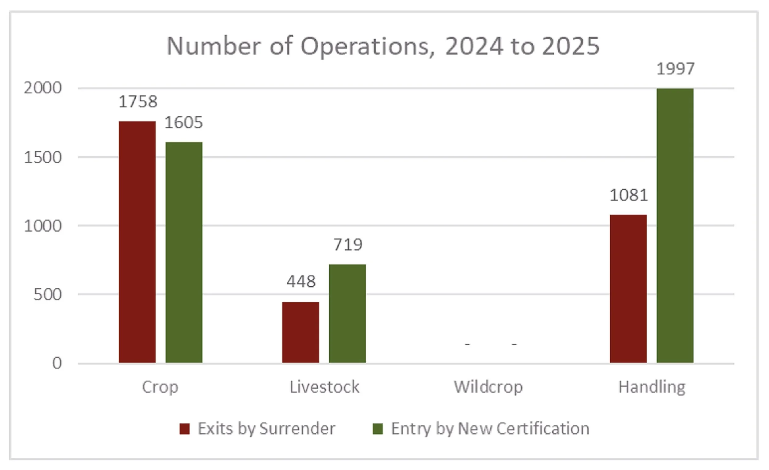 As of December 20, 2025, 28,881 operations are certified organic in the United States. Over the duration of 2025, 3,539 operations newly entered certification, while 2,825 operations voluntarily surrendered their certificates. Accounting for all changes (including suspensions and reinstatements), the organic sector saw a net gain of 792 operations overall across all certification scopes (crops, livestock, and handling).