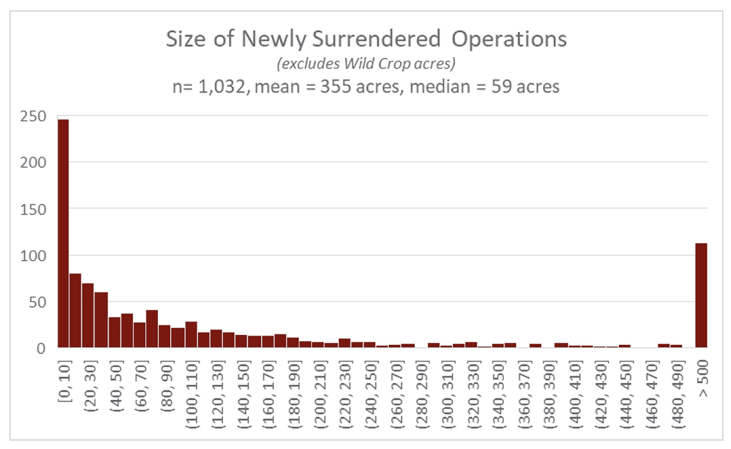 The distribution of farm size reveals something important about organic agriculture's changing structure. Newly certified operations were on average 203 acres with a median of 51 acres, while surrendered operations were on average larger at 355 acres with a median of 59 acres. The organic sector appears to be gaining smaller operations, particularly near urban areas, while losing somewhat larger operations, particularly in rural regions.